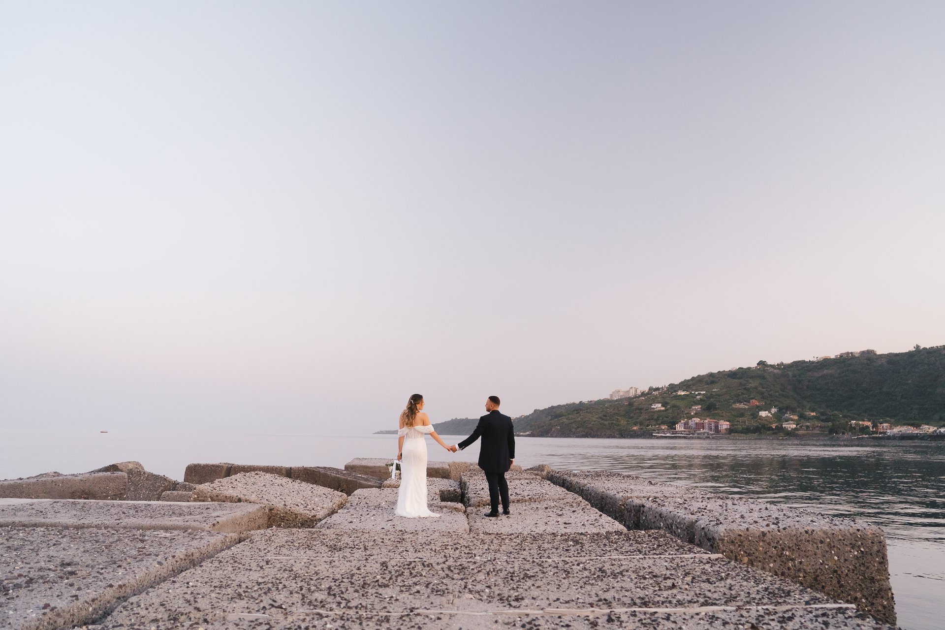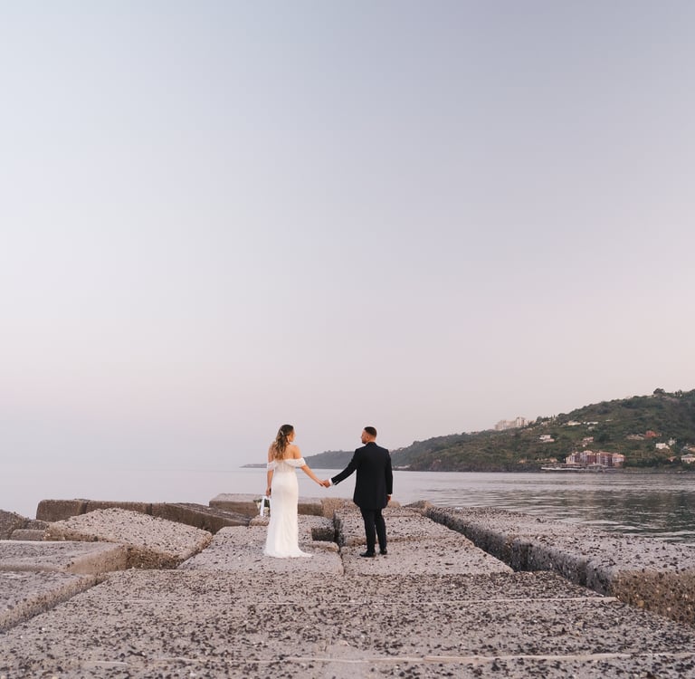 Per il servizio fotografico ci siamo spostati a Scalo Pennisi, che al tramonto regala scenari sorprendenti. Il cielo, diventato rosa in pochi minuti, ha avvolto Alessia e Marco in una luce morbida e romantica, perfetta per raccontare il loro legame con naturalezza. È in questi momenti che la Sicilia offre davvero il meglio, e il ruolo del fotografo di matrimonio diventa raccontare ciò che già esiste: autenticità, complicità, verità.